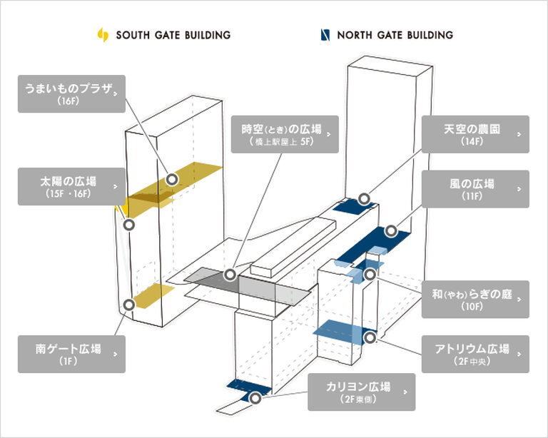 남쪽의 사우스 게이트 빌딩에는 다이마루, 포켓몬 센터, 유니클로, 도큐 핸즈 등이 입점한 백화점과 함께 호텔 그란비아 오사카가 있습니다. 노스 게이트 빌딩은 의류, 화장품 및 다양한 숍이 입점해 있는 LUCUA 및 LUCUA 1100 구역의 쇼핑 건물입니다. 역 안에도 많은 상점이 있기 때문에, 이곳은 오사카의 랜드마크 중 하나입니다. 하루 중 대부분의 시간대에 항상 많은 사람들이 길거리를 오고 갑니다.