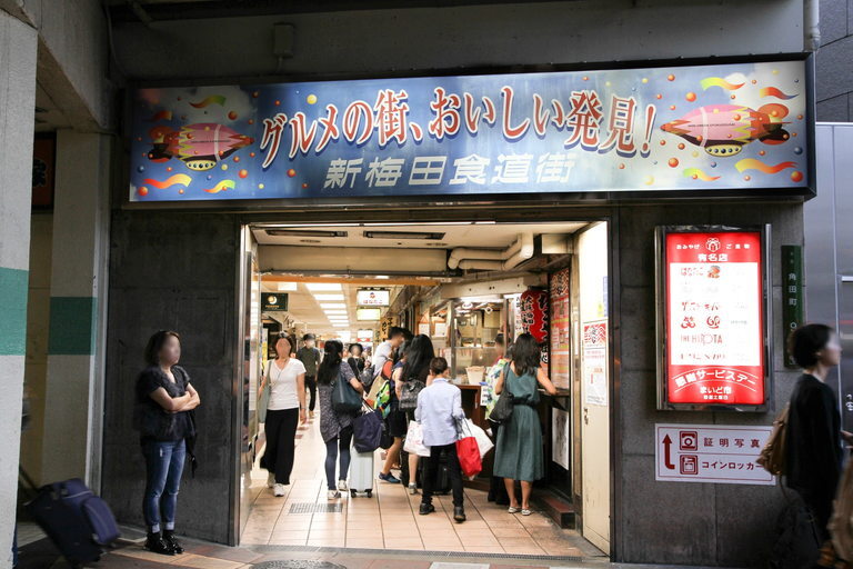 역의 미도스지 남쪽 출구에서 나와 한큐 백화점을 향해 있는 횡단보도를 건너면 신 우메다 식당가가 있습니다. 복고풍 음식 건물로, 안에는 약 100개의 식당이 있습니다. 꼬치튀김 전문 마쓰바 소혼텐, 오뎅 전문 다코우메, 다코야키를 판매하는 하나다코를 비롯해 태국 레스토랑 등 이색적인 식당과 향토주를 파는 식당 등 다양한 가게들이 있습니다. 아늑한 분위기의 식당이 많은 것으로도 유명합니다.
