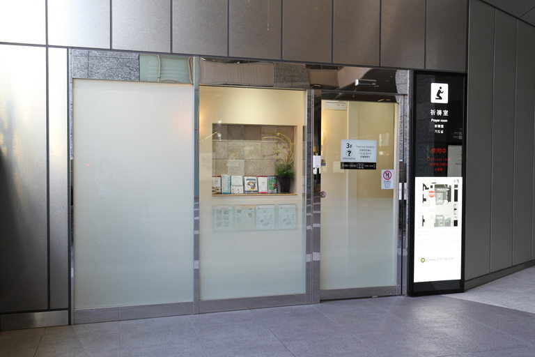 사우스 게이트 플라자의 사우스 게이트 빌딩 1층에 사용하실 수 있는 기도실이 있습니다. 남성용과 여성용 기도실이 별도로 준비되어 있고, 몸을 씻을 수 있는 정화실도 있습니다. 사용하시려면 먼저 노스 게이트 빌딩 3층의 인포메이션 데스크로 가셔서 간단한 양식의 신청서를 받으세요.
