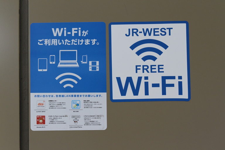 오사카시 역 안에는 공공 Wi-Fi 서비스를 이용할 수 있는 장소가 몇 군데 있습니다. 사용 가능 지역에는 JR-WEST라는 스티커가 붙어 있습니다. Wi-Fi를 사용하시려면 입국 전에 게스트 코드를 받아야 한다는 것을 꼭 명심해 주십시오. 미리 코드를 받지 않은 경우는 노스 게이트 빌딩 3층 인포메이션 데스크에서 Wi-Fi 라우터를 대여할 수 있습니다.
