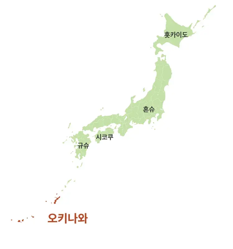 오키나와현은 일본 열도 남서쪽에 위치하며 남북으로 약 400km, 동서로 약 1,000km의 광대한 해역에 점재한 160개 섬들로 구성되어 있습니다. 육지 면적은 일본 총면적의 약 1%, 인구도 일본 전체의 1% 정도입니다.