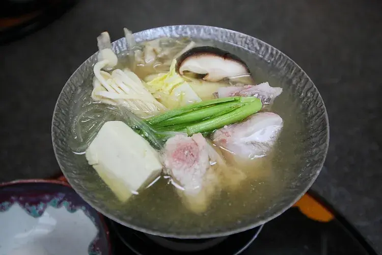 시마모토의 이리야키는 닭고기와 함께 생선으로는 타이(도미)로 맛을 냈고, 두부, 버섯, 배추, 당면 등도 함께 담겨서 나오며 고체 연료로 계속 끓여먹을 수 있도록 해줍니다.