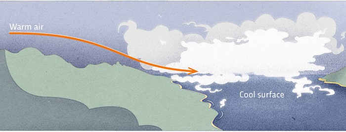 이류 안개의 한 유형인 바다 안개는 따뜻하고 습한 공기가 육지에서 더 차가운 바다로 굴러 떨어지거나 따뜻한 날씨 전선이 차가운 해류에 부딪힐 때 발생할 수 있습니다. 영국의 경우 북동쪽 해안은 북해의 찬 바닷물 때문에 바다안개가 발생하기 쉽습니다.