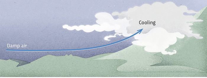 오르막 안개는 언덕 안개의 일종으로 바람이 습한 공기를 경사면, 언덕 또는 산 위로 불어올 때 형성되며 상승하면서 냉각됩니다. 냉각되면서 수분이 응결되고 경사면을 계속해서 표류하면서 안개가 형성됩니다.