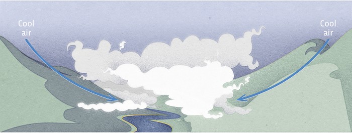 계곡안개는 일반적으로 계곡의 가장 낮은 부분에 차고 빽빽한 공기가 응결되어 안개를 형성하면서 형성됩니다. 그것은 언덕이나 산과 같은 지역 지형에 의해 제한되며 며칠 동안 지속될 수 있습니다.