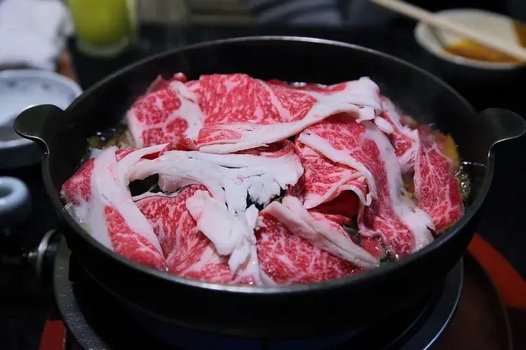 스키야키 나베에 우지(牛脂: 소기름)를 두른 뒤 시라타키(白滝: 실곤약)을 넓게 깔아준다는 것입니다. 또 한가지는 야채, 두부, 그리고 소고기를 올린 뒤에 바로 스키야키 소스를 붓는 것이 아니라, 토리카라 스프(닭육수)를 먼저 살짝 부은 뒤에 스키야키 소스를 붓는다는 것입니다.