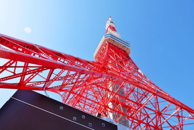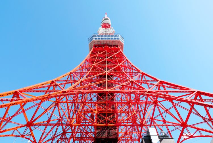 붉은 색과 흰색의 대담한 줄무늬가 있는 도쿄 타워를 보면 드디어 메트로폴리탄 도쿄에 도착했음을 알 수 있습니다.