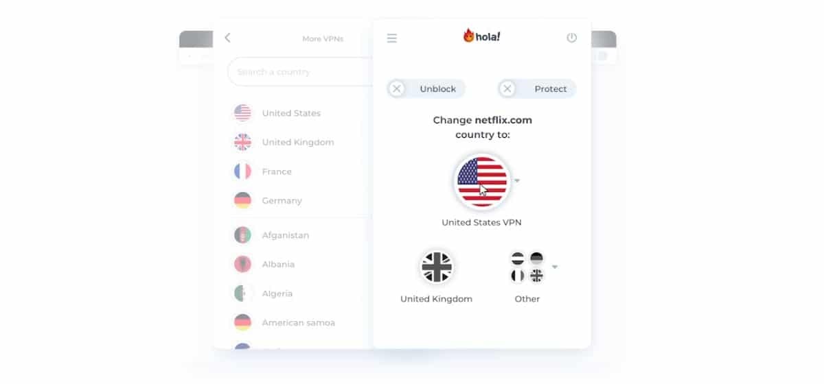 Hola VPN을 설치하는 장치에 관계없이 작동은 항상 동일합니다. 인터넷 브라우저를 시작하기 전에 먼저해야 할 일은 연결하려는 국가를 선택하십시오..