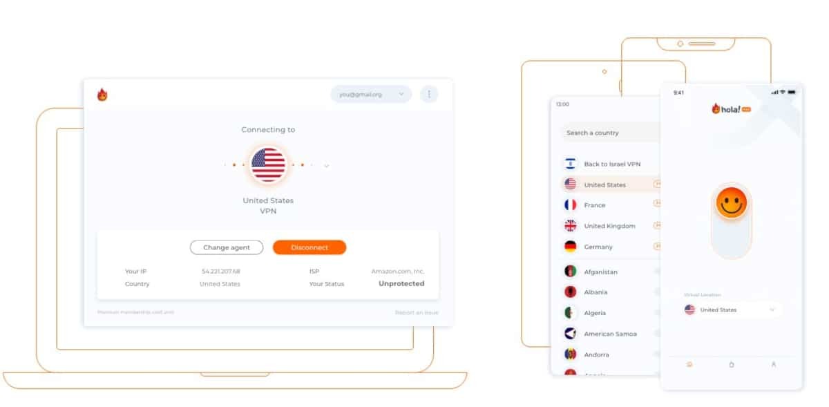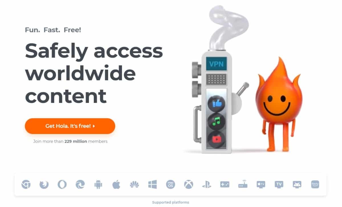 Hola VPN은 Android, iOS, macOS, Linux, Windows, Xbox, Playstation, 라우터, Apple TV, 스마트 TV, Android TV 및 Fire TV와 함께 확장을 통해 Chrome, Firefox, Edge 및 Opera 브라우저.