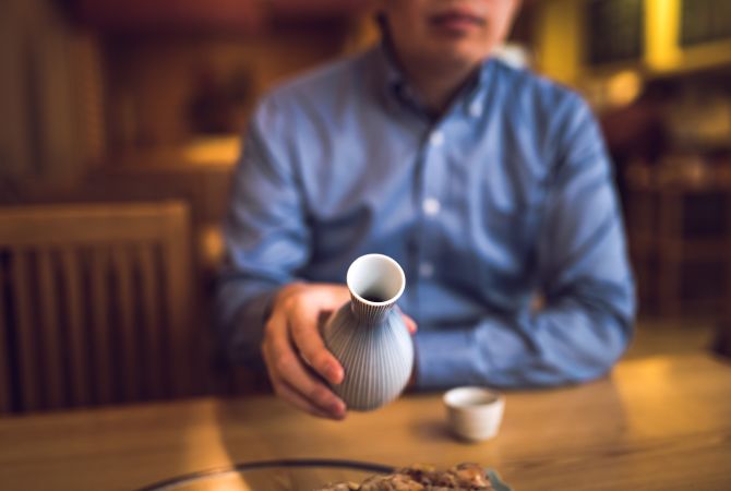 연장자에게 술을 따를 때는 오른손으로 도쿠리를 들고 왼손으로는 병 바닥을 살짝 받쳐줍니다. 연장자에게서 술을 받을 때는 한 손은 잔 아래에 두고 나머지 한 손으로 잔 옆을 잡습니다. 연장자가 아랫사람에게 술을 따르거나 아랫사람으로부터 받을 때는 한 손만 사용해도 됩니다. 사케 잔을 받았으면 적어도 한 모금은 입에 대고 다시 상에 내려놓는 것이 예의입니다.