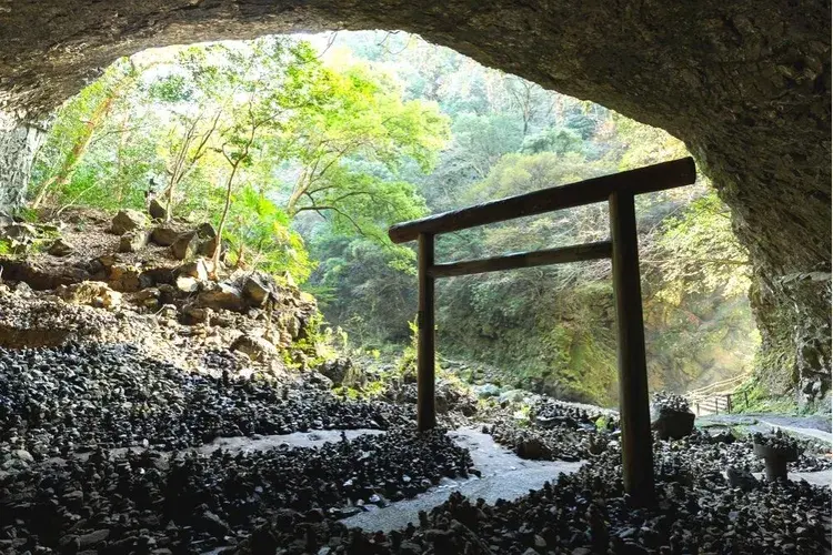 매우 신성시되는 곳이라 동굴 내부로 들어갈 수는 없지만, 대신 신사의 주요 건물 중 하나인 니시혼구에서 내부를 바라볼 수 있습니다. 길을 따라 조금 더 걸어가면 또 다른 커다란 동굴인 아마노 야스가와라와 수백 개의 작은 돌탑이 있는 고즈넉한 도리이가 있습니다. 작은 돌탑을 쌓아 소원을 빌면 그 소원이 이루어진다고 믿기 때문에 이곳을 방문하는 사람들마다 도리이 주변에 탑을 쌓은 것입니다. 이 작은 탑들은 풍경에 신비함을 더합니다.