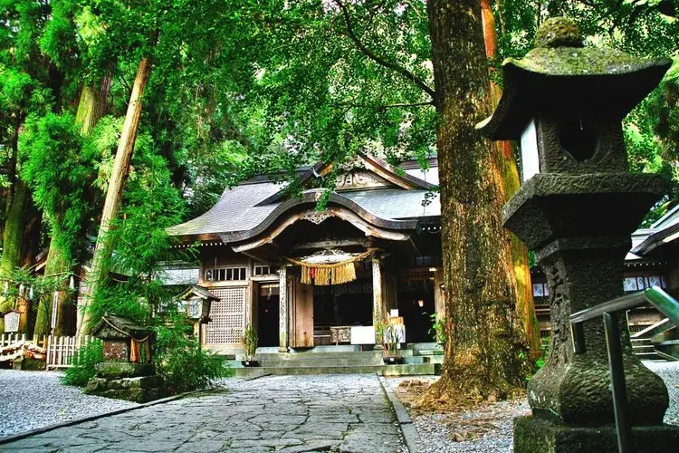 울창한 숲속에 자리 잡고 있는 신사는 1800년 이상의 되었다고 전해지며, 가장 오래된 나무는 수령이 약 1000년이라고 합니다. 다카치호 신사에서 가장 유명한 명소 중 하나는 바로 뿌리가 얽힐 정도로 가깝게 자란 두 그루의 삼나무인 메오토스기 즉, ’부부 나무(夫婦杉)’입니다. 커플이나 부부가 손을 잡고 나무 주변을 걸으면 행복해진다고 전해집니다. 경내에는 일본의 신에 관한 유명한 이야기들을 공연하는 가구라 극장도 있습니다.