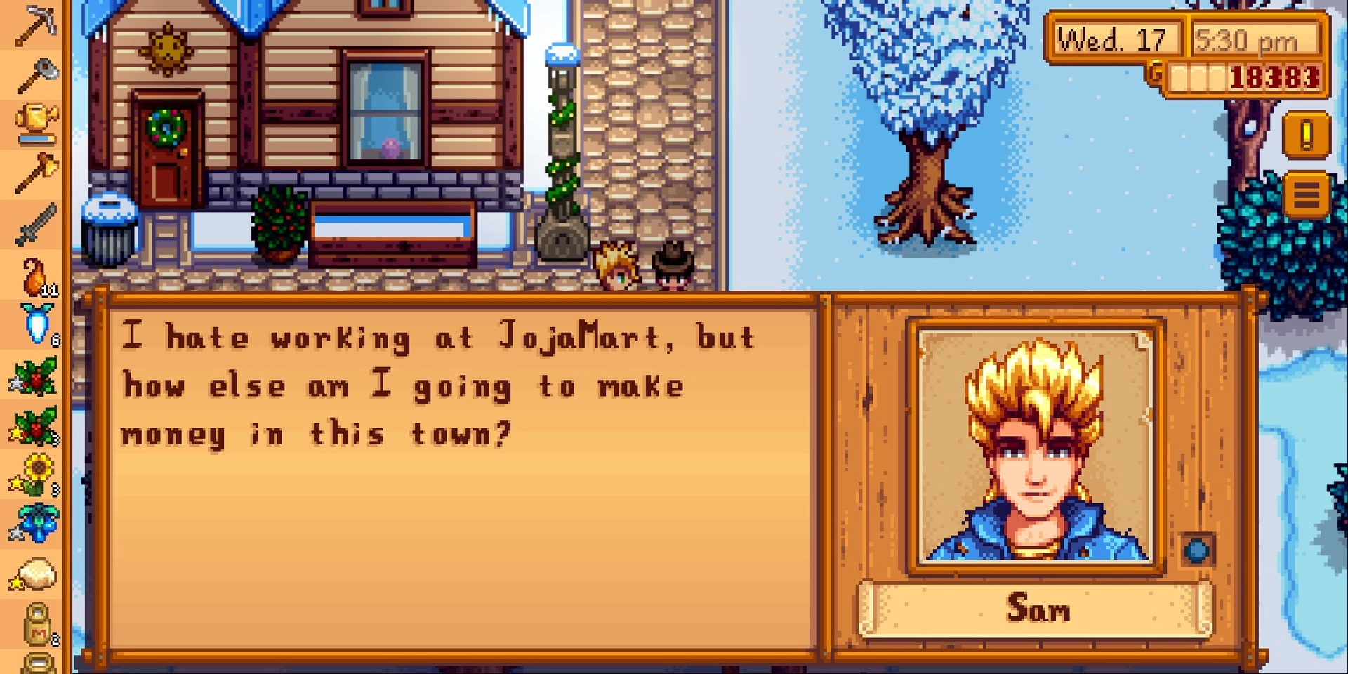 Stardew Valley의 Sam은 음악 연주를 좋아하는 청년입니다. 그의 방은 악기로 가득 차 있고 친구 Sebastian과 함께 밴드를 시작하기를 희망합니다.