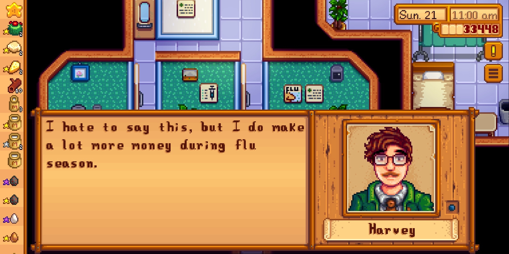 Stardew Valley의 Harvey는 마을 의사입니다. 그는 대부분의 시간을 일하는 데 보내며 각 마을 사람들에게 연례 검진을 제공합니다.