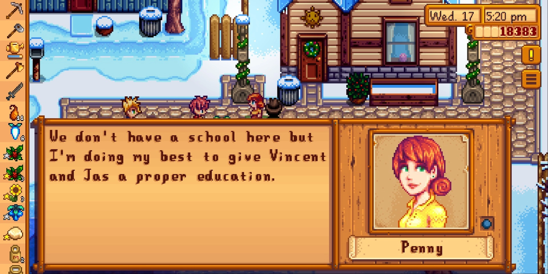Stardew Valley의 Penny는 Pam의 조용하고 겸손한 딸입니다. 그녀는 Sam과 좋은 친구이며 박물관에서 Jas와 Vincent를 가르치는 데 많은 시간을 보냅니다.