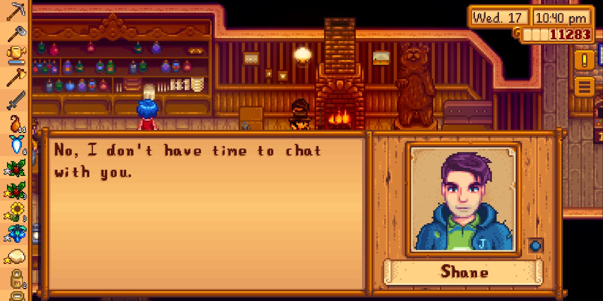 Stardew Valley의 Shane은 우울증과 알코올 의존증을 앓고 있는 Marnie의 조카입니다. 그는 마을에 친구가 없지만 닭에 대한 강한 애착을 가지고 있습니다.