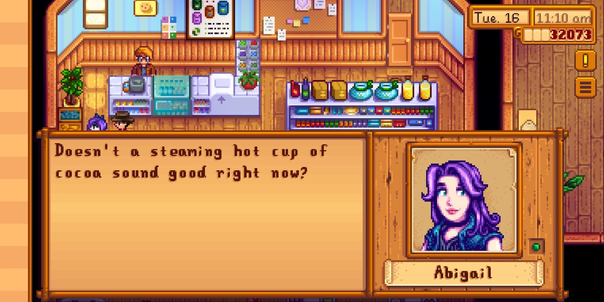 Stardew Valley의 Abigail은 Pierre와 Caroline의 보라색 머리 딸입니다. 그녀는 묘지에서 놀고 개구리를 찾는 것과 같은 특이한 취미를 가지고 있습니다.