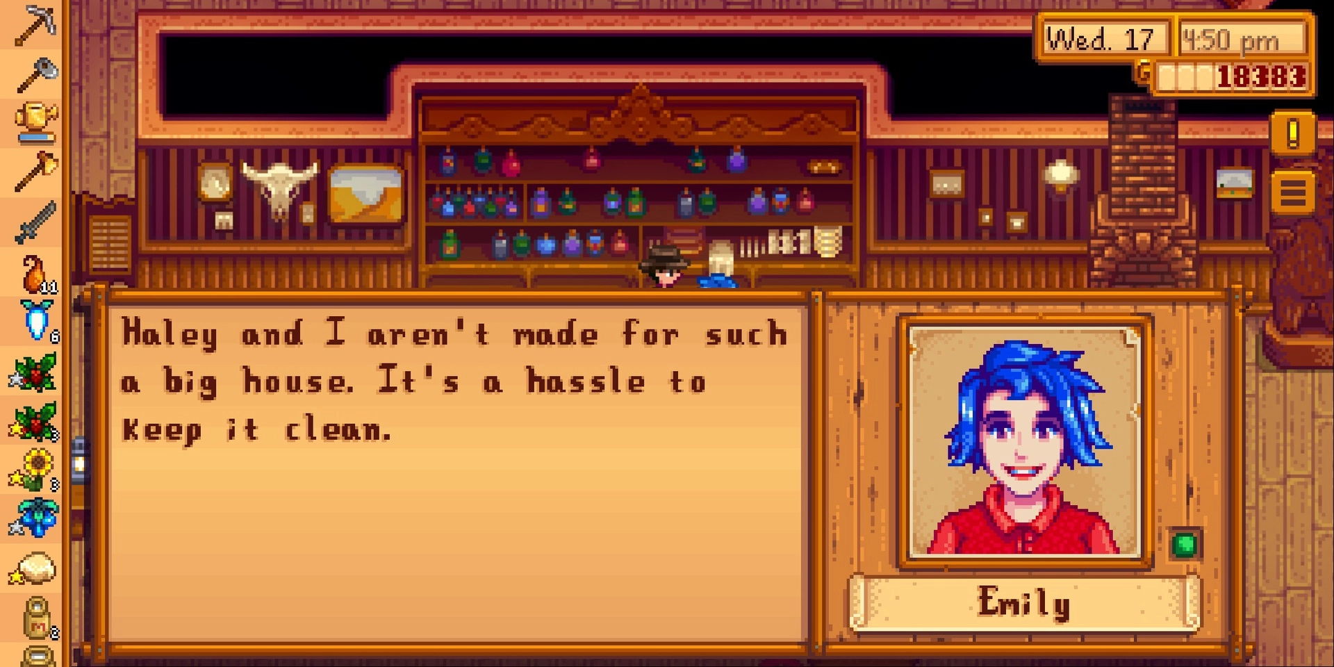 Stardew Valley의 Emily는 파란 머리의 Haley 자매입니다. 그녀는 Stardrop Saloon에서 아르바이트를 하지만 그녀의 진정한 열정은 자신의 옷, 보석, 명상을 만드는 것입니다.