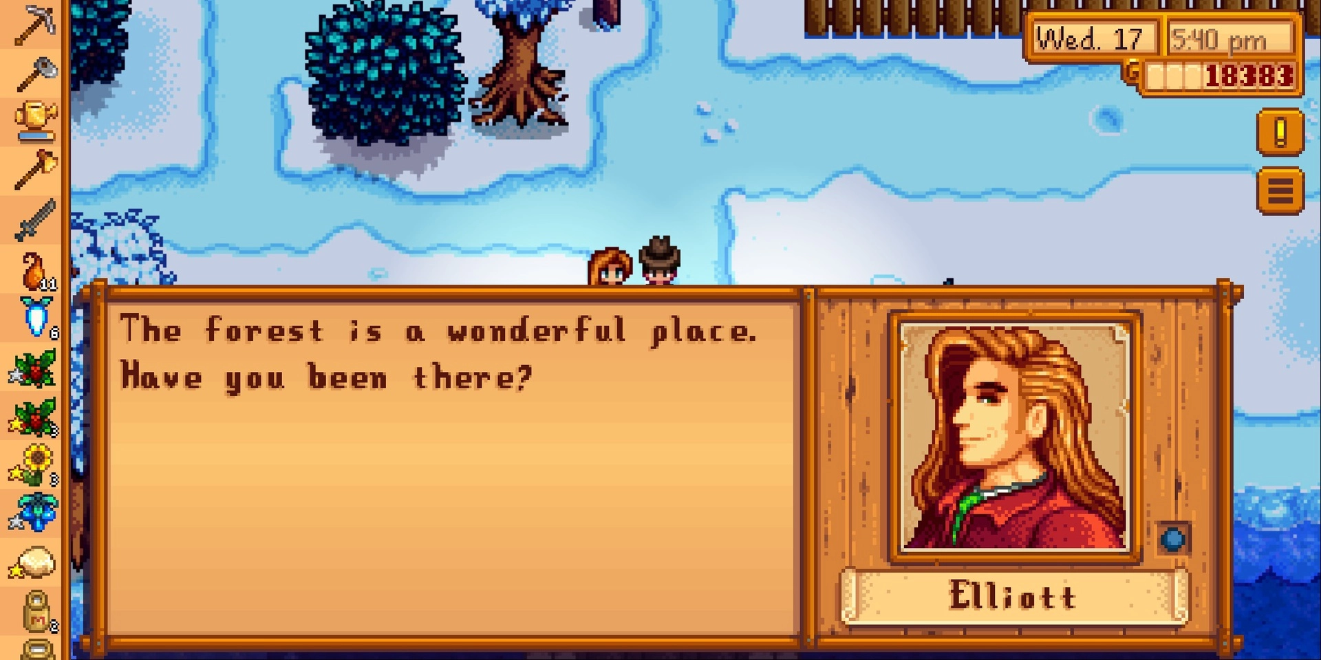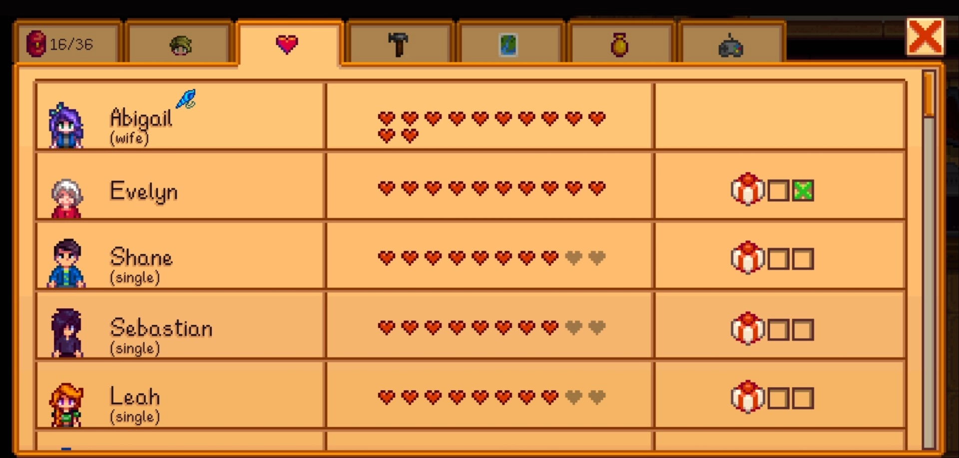 Stardew Valley의 우정은 하트 미터로 표시됩니다. 일반 주민의 최대 하트는 10개이며 배우자는 12개로 늘어납니다. 위에서 볼 수 있듯이 메뉴에서 전체 목록을 찾을 수 있습니다.