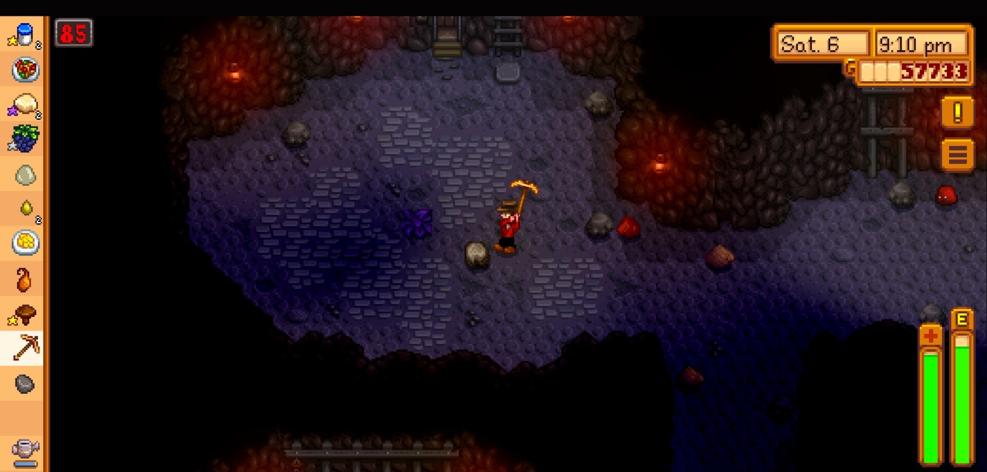 하루가 끝나기 전에 집으로 돌아가 잠자리에 들어야 하기 때문에 시간이 촉박합니다. 광산에서 기절하면 획득한 귀중품의 대부분 또는 전부를 잃게 되며 운이 나쁘면 핵심 도구도 잃게 됩니다. 광산을 진행하려면 5층마다 꼭대기에 있는 엘리베이터를 통해 지름길을 열 수 있으므로 많은 여행이 필요합니다.
