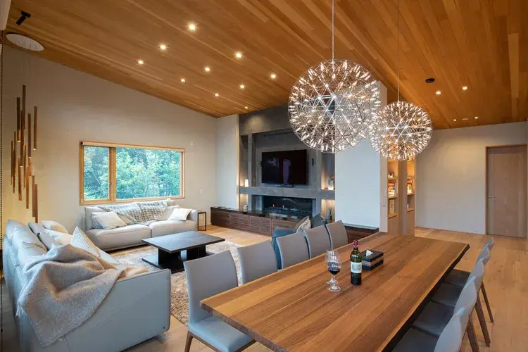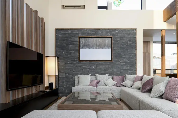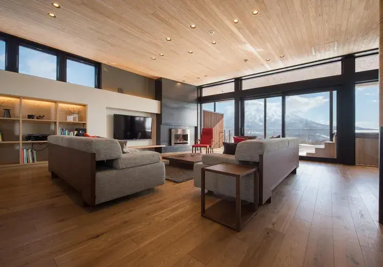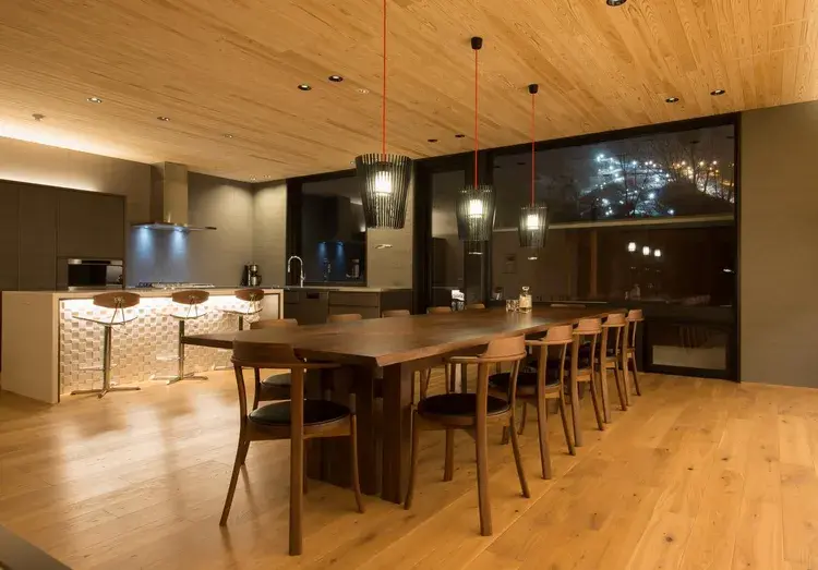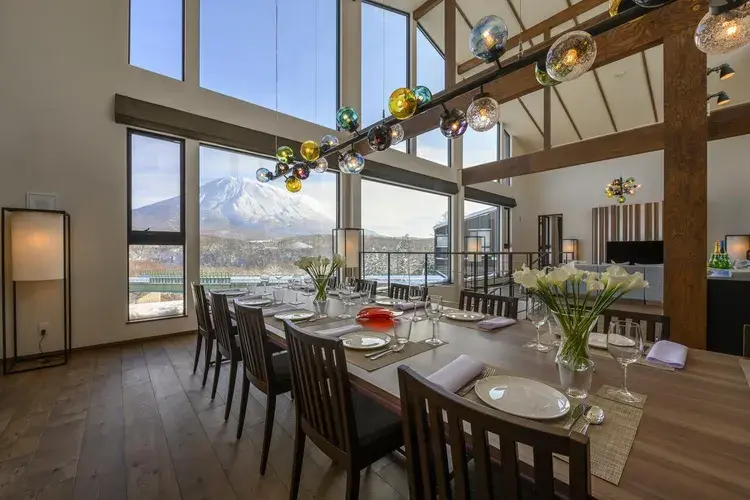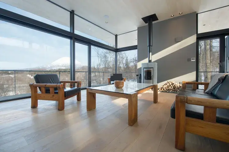 꼭대기에는 구로카와테쓰(흑피철, 검은 막을 입힌 것으로 쉽게 녹슬지 않습니다) 벽난로를 설치한 거실, 창밖에는 요테이잔이 그 웅장한 모습을 보여줍니다. 앞쪽에는 식탁이 있고 반대쪽 창문을 통해 스키장을 조망할 수 있는 최고의 입지입니다.