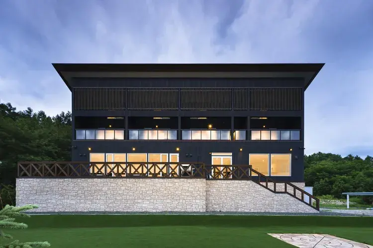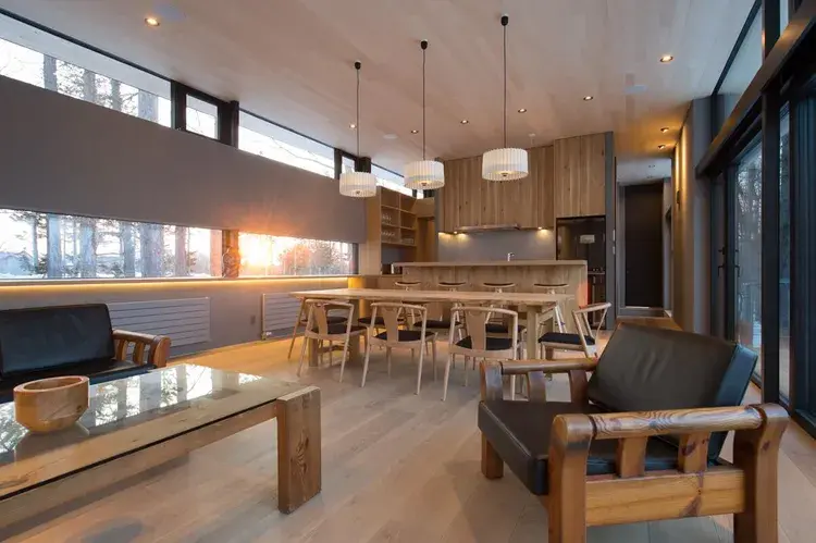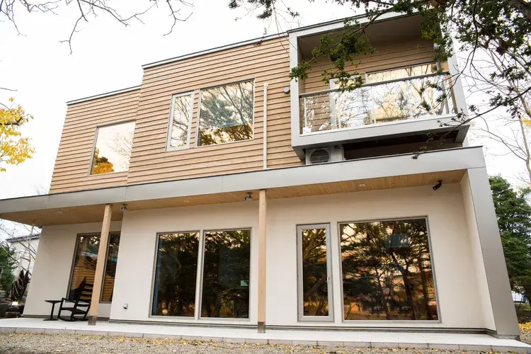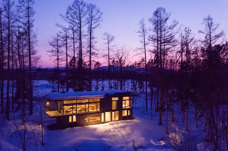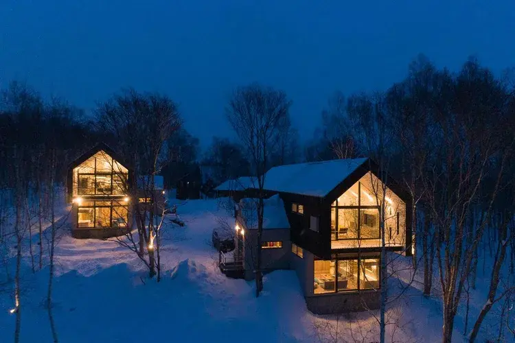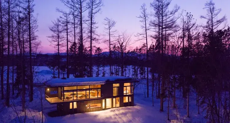 2층이 대담하게 돌출되어 있는 구조의 모던한 디자인의 빌라 2채가 주변의 숲을 즐길 수 있도록 설계되어 홋카이도 특유의 풍성한 자연을 만끽할 수 있습니다. 2곳의 스키장까지 차로 수 분 거리여서 입지도 좋습니다.