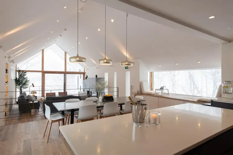 천장이 높은 거실에는 가스히터가 비치되어 있어 여유로운 시간을 보낼 수 있습니다. 식탁도 크기 때문에 인원이 많아도 문제없습니다. 주방의 편의 시설도 잘 갖추어져 있어 사용하기 편리합니다.