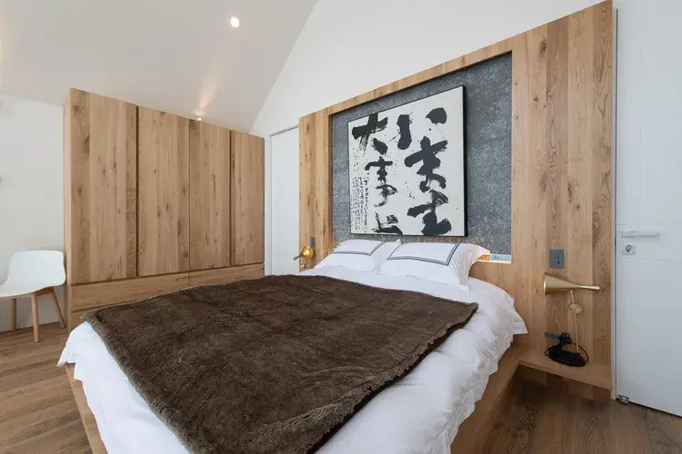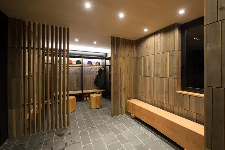 특히 빌라 중심부는 스키어를 위해 설계되어 있어서 보드 스탠드, 스키복 건조대 등이 넓은 공간에 충분한 설비가 갖추어져 있습니다. 현지에서 벌채한 거대한 낙엽송으로 만든 벤치 스툴은 그 지역의 것을 최대한 활용한다는 컨셉 그대로입니다.