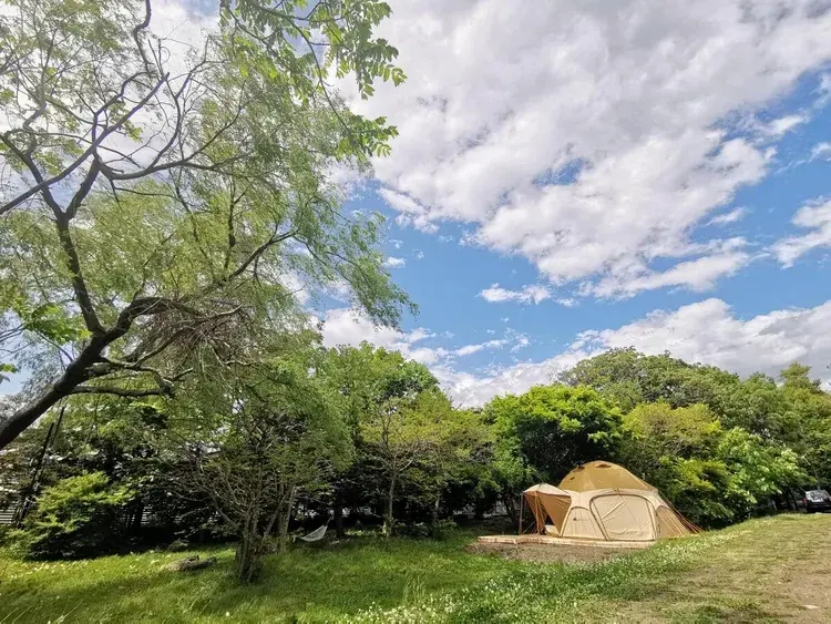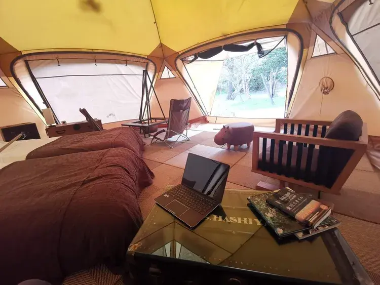 마당에 설치된 텐트에서도 잠을 잘 수 있습니다. 이외에도 그네와 해먹 등이 있어 아이들도 즐길 수 있습니다. 바비큐 세트와 지붕이 있는 테이블도 완비되어 있어, 인원수가 많은 가족, 친구들과의 이용에 추천할 만한 별장입니다.