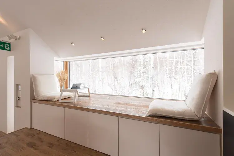 돌출되어 있는 2층 창문을 통해 홋카이도의 숲을 조망할 수 있고, 벽난로가 설치된 거실에서 편안하게 쉴 수 있습니다. 색다른 형태의 창문은 여유롭게 독서 등을 즐길 수 있도록 설계된 벤치가 있습니다. 창밖에서 시시각각으로 표정을 바꾸는 자연을 만끽하며 프라이빗한 시간을 보내보세요.
