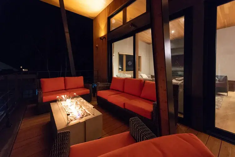 최상층의 탁 트인 거실/다이닝/주방 공간(위의 첫 번째 사진). 날씨가 좋으면 요테이잔을 볼 수 있습니다. 오른편 안쪽의 창밖에 있는 것이 벽난로가 있는 발코니(위의 두 번째 사진). 밤바람을 느끼며 벽난로의 불을 바라보며 가족, 친구들과 이야기 나눠보시는 것은 어떨까요?