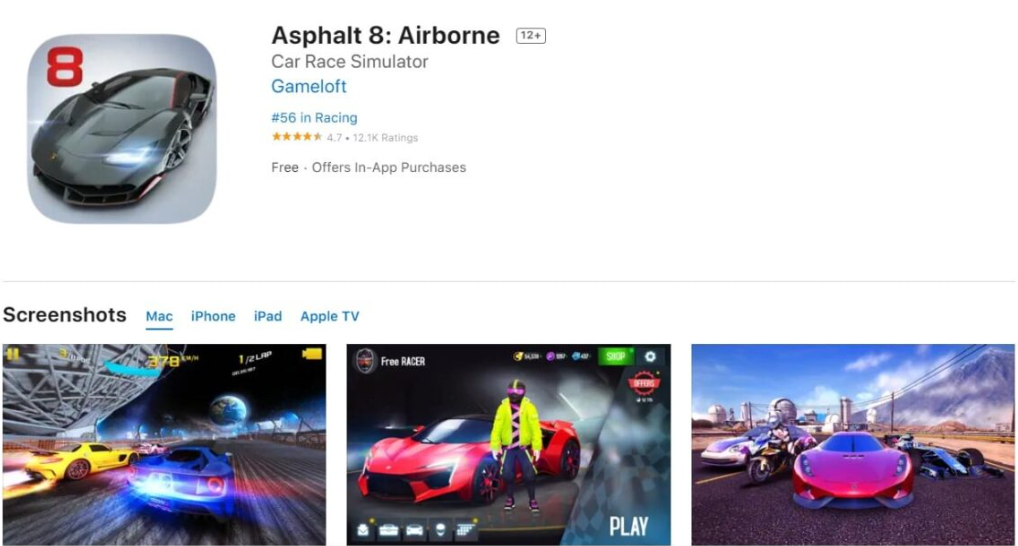 현재 애플 앱스토어 게임 경쟁에서 아스팔트 8은 56위에 올라 니드포스피드 , 마리오 카트 등 다른 타이틀과 어깨를 나란히 하고 있다. 이 게임의 또 다른 중요한 점은 무료로 다운로드할 수 있다는 것입니다.