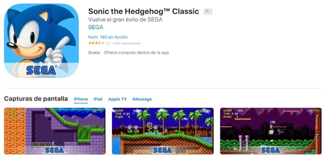모든 연령대의 플레이어에게 이상적이며 모험으로 분류되는 Sonic은 Apple TV, iMessage, iPad 및 iPhone 장치와 호환됩니다 . 게임의 개발자는 고전적인 이름인 Sega와 동일합니다. 이 목록에 있는 다른 사람들과 마찬가지로 플레이하는 데 어떤 유형의 인터넷 연결도 필요하지 않습니다.