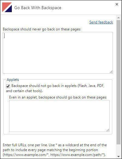 이 기능을 활성화하면 백스페이스가 탐색 도구로 작동하지 않도록 하려는 페이지 몇 개를 화이트리스트에 추가할 수도 있습니다.
