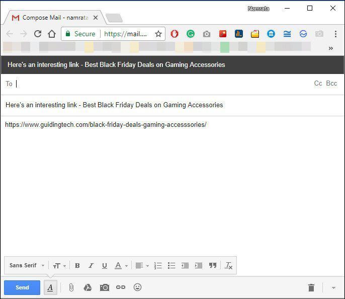 확장 아이콘을 클릭하면 링크와 제목으로 구성된 이메일 작성 창이 열립니다. 끝에서 필요한 것은 몇 줄의 텍스트를 추가하고(원하는 경우) 보내다.
