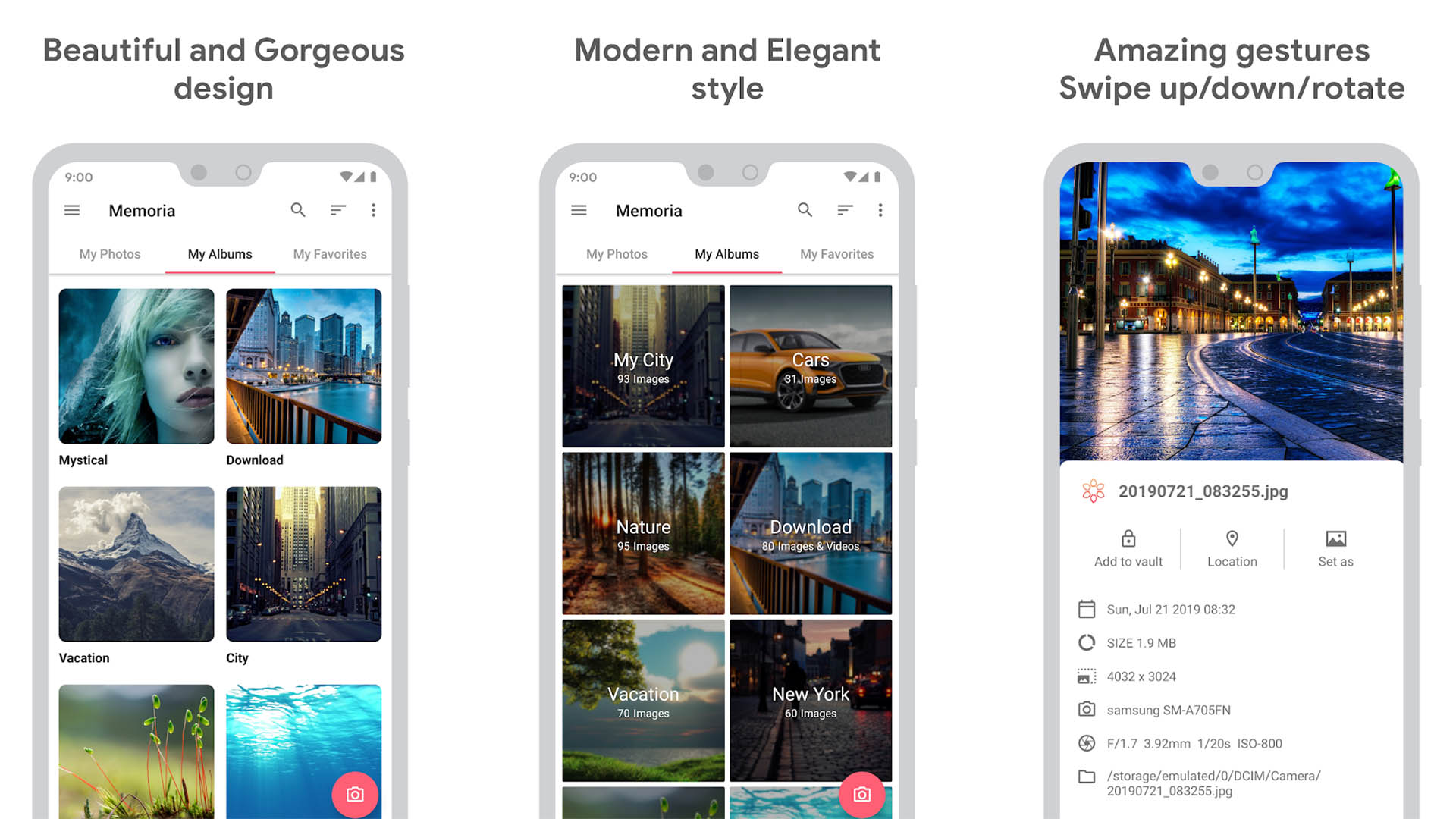 Memoria Photo Gallery는 목록에 있는 최신 갤러리 앱 중 하나입니다. 이것은 좋은 수준의 사용자 정의, 일반적으로 부드러운 성능 및 일부 보안 기능을 제공합니다. 테마, 지문 인증을 받고 원하지 않는 앨범을 숨길 수도 있습니다. 이 앱에는 암호화된 볼트와 다양한 보기 모드도 함께 제공됩니다. 앱에 여전히 여기 저기 가끔 버그가 있지만 모든 상자를 체크하는 것 같습니다. 개발자는 이것으로 약간 거친 패치에 있지만 작동하면 잘 작동합니다.