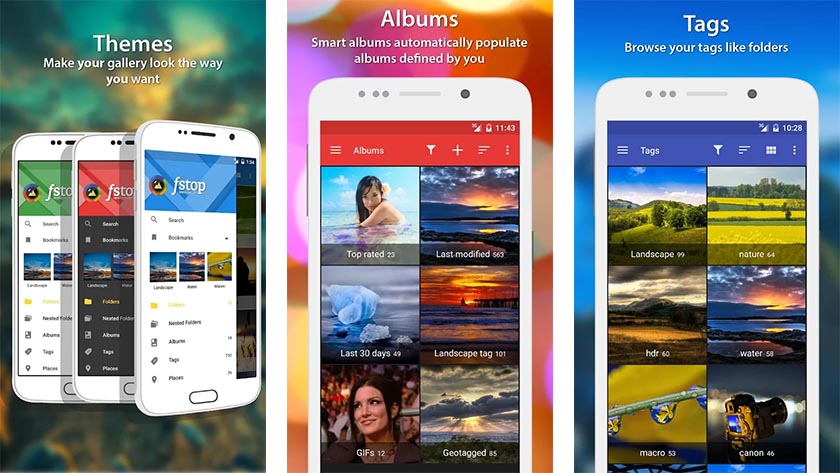 F-Stop Media Gallery는 오래된 갤러리 앱 중 하나입니다. 이것은 몇 가지 정말 괜찮은 기능과 함께 머티리얼 디자인으로 강조된 더 평평하고 깔끔한 디자인을 특징으로 합니다. 멋진 메타데이터를 기반으로 사진을 검색할 수 있으며 쉽게 정리할 수 있도록 사진에 태그를 추가할 수 있습니다. 또한 메타데이터(EXIF, XMP 및 IPTC 정보 포함)를 읽고 자체적으로 항목을 정렬하는 데 도움이 되는 스마트 앨범 기능이 있습니다. 무엇보다도 GIF를 재생합니다! 이것은 시끄러운 것을 좋아하는 사람들을 위한 가장 화려한 갤러리 앱 중 하나입니다. 일부 기능은 프로 버전이 필요하지만 무료 버전은 여전히 매우 기능적입니다.