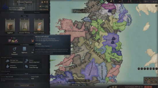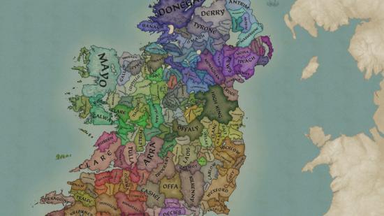 Tales of Ireland 는 전적으로 아일랜드에 초점을 맞춘 전체 전환 모드로, 다른 역사적 전략 게임에서는 볼 수 없는 수준의 깊이와 헌신을 제공합니다. 대략 기원전 400년인 게임 시작 시 32개 왕국에 1000개 이상의 카운티가 분포되어 있습니다. 그것은 '침략의 책'을 기반으로 하며 아일랜드 신화에 푹 빠져 있습니다.