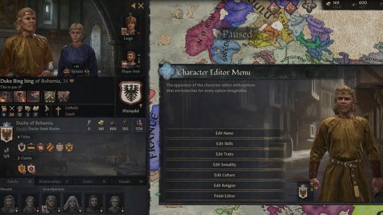 이 메뉴를 통해 캐릭터의 모든 스탯을 100까지 올리거나, 유전자를 버프하거나, 캐릭터 통화(및 실제 통화)를 추가하거나, 다양한 라이프스타일에 맞게 특전 포인트를 조정하는 것과 같은 거의 모든 것을 달성할 수 있습니다. 가장 최근 업데이트에는 캐릭터의 머리 스타일을 변경하고 원하는 타이틀을 주장하는 기능이 포함되었습니다. 기본 게임의 CK3 캐릭터 생성 옵션 이 만족스럽지 않다면 이 모드가 적합합니다.