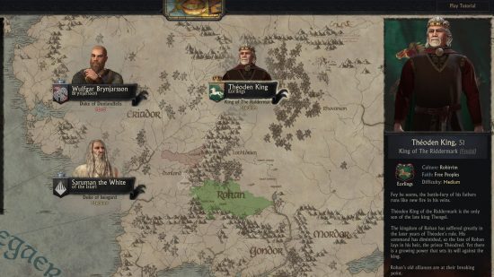 초기 릴리스는 Rohan 왕국과 Saruman 및 산적에 대한 투쟁에 중점을 둡니다. King Théoden, Saruman the White 또는 Wulfgar Brynjarsson of Dunland로 플레이할 수 있습니다. 이 후자의 선택은 사실 인기 있는 RTS 게임인 반지의 제왕: 중간계를 위한 전투 에서 가져온 것 입니다 . 팀은 가능한 한 중간계의 나머지 지역으로 확장할 계획입니다.