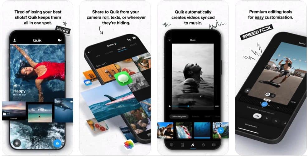 Quik은 GoPro 사용자에게 유용한 또 다른 크로스 플랫폼 앱입니다. 이 앱을 사용하면 iPhone을 사용하여 GoPro 장치를 원격으로 제어하고 영상을 편집할 수도 있습니다. 사진, 제목을 쉽게 추가하고 비디오를 음악과 동기화하는 동시에 통계의 그래프를 포함할 수 있습니다. 이것은 무료 앱이지만 일부 추가 필터 및 테마를 구입할 수도 있습니다.