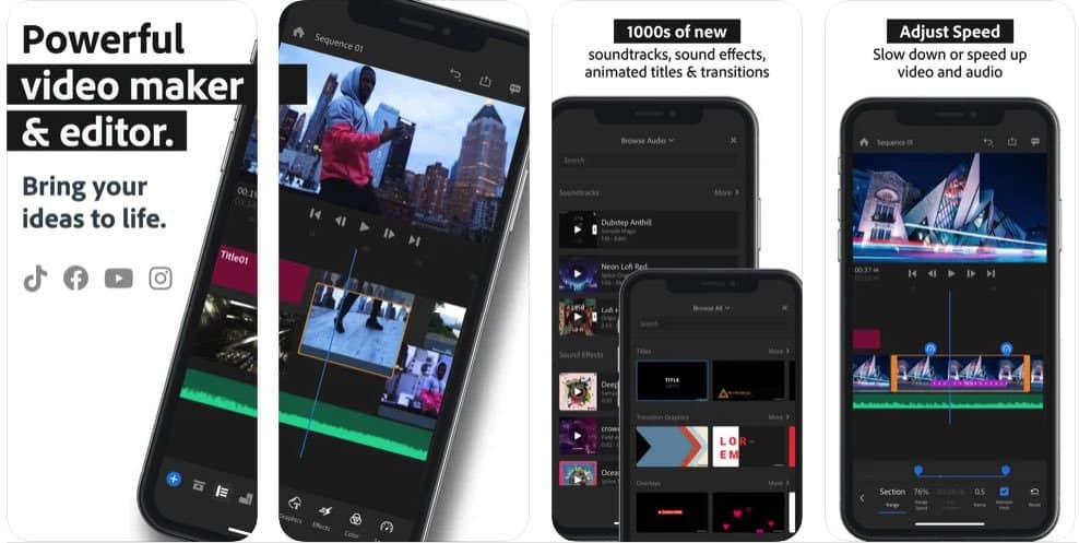 이것은 비디오 편집을 매우 쉽게 만들고 YouTube 세대를 대상으로 하는 크로스 플랫폼 앱입니다. 이 앱은 Adobe의 데스크톱 도구보다 훨씬 사용하기 쉽지만 이동 중에 비디오를 쉽게 처리하고 소셜 미디어에 업로드할 수 있습니다. 예를 들어 이 앱을 사용하여 비디오를 각 소셜 미디어 플랫폼에서 요구하는 품질 수준 및 특정 종횡비로 자동 변환할 수 있습니다. 이 앱이 전문적인 사용에 적합한 이유는 콘텐츠를 클라우드에 업로드하고 컴퓨터나 태블릿에서 계속 작업할 수 있다는 사실입니다.