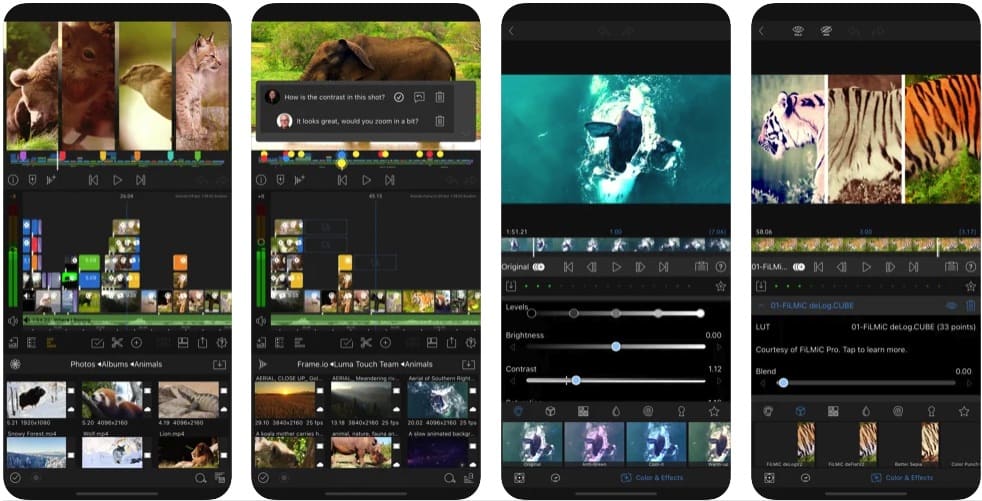 LumaFusion은 특히 데스크톱 비디오 편집에 필적하는 복잡한 앱이기 때문에 iPhone에서 가장 인기 있는 비디오 편집 앱 중 하나입니다. LumaFusion에는 몇 가지 매우 강력한 기능이 있지만 사용자가 반응이 빠른 자기 타임라인을 통해 4K 영상을 쉽게 편집할 수 있는 액세스 가능한 앱입니다. 오디오 믹싱 기능 및 색상 보정 도구를 포함하여 광범위한 효과 중에서 선택할 수도 있습니다. 다중 트랙 편집기를 사용하면 최대 6개의 비디오 및 오디오 트랙을 쉽게 저글링할 수 있으므로 오버레이 효과를 수행할 때 편리합니다.