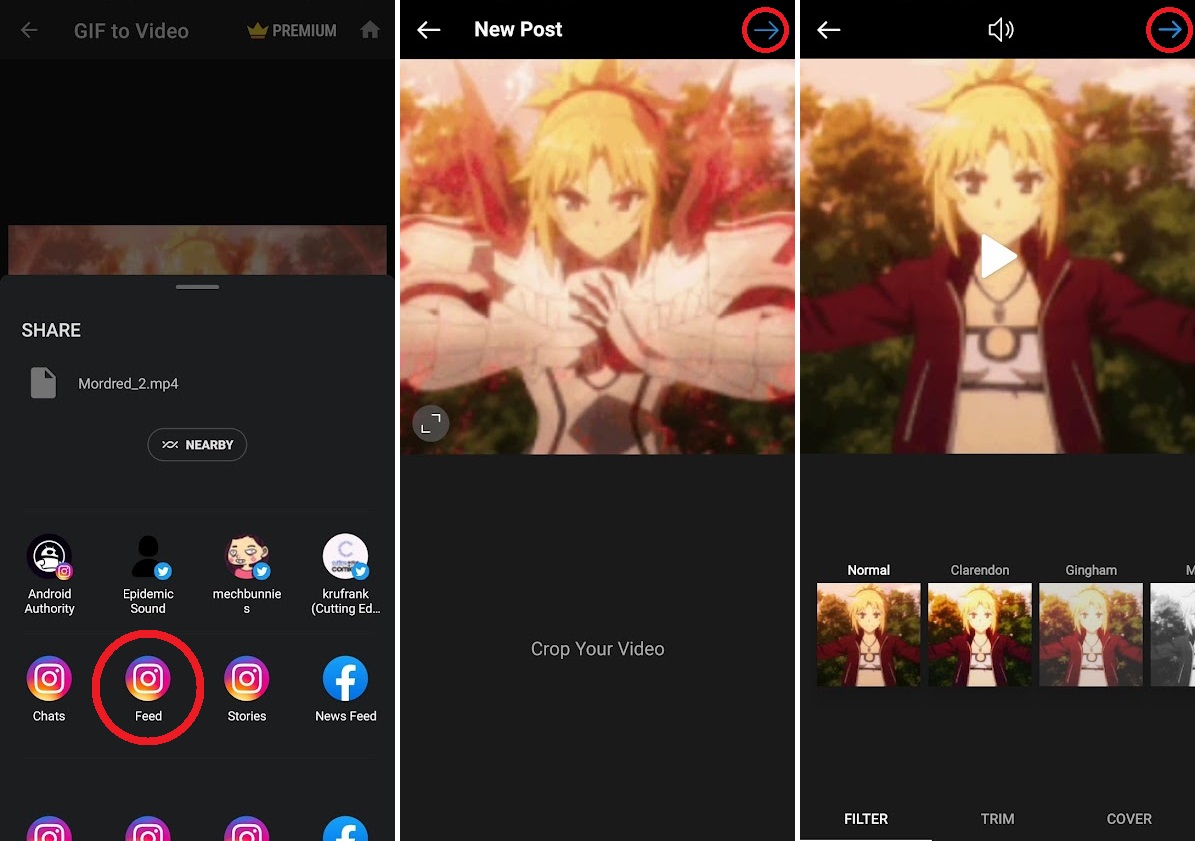 공유 메뉴에서 피드를 눌러 선택한 GIF 를 Instagram 게시물로 업로드합니다. 이렇게 하면 비디오를 자른 다음 편집할 수 있는 Instagram 계정으로 리디렉션됩니다. 계속하려면 오른쪽 상단 모서리에 있는 파란색 화살표를 누르십시오.
