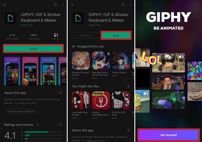 Google Play Store(Android) 또는 App Store(iOS) 에서 GIPHY 를 다운로드하여 설치 합니다. 설치가 완료되면 앱을 열고 시작하기를 누르세요! 계정을 만들거나 로그인합니다.
